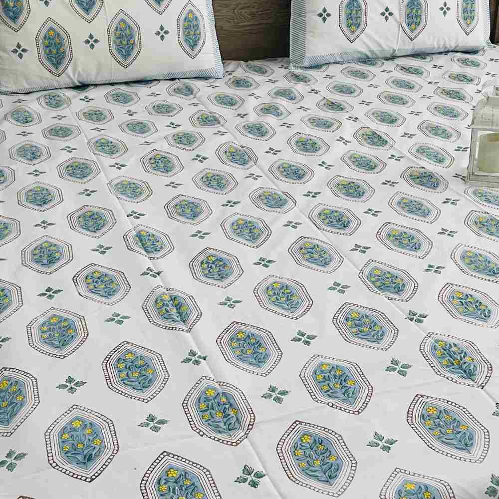 Premium Handblock flat kingsize bedsheet with 2 pillow covers, 400 TC 100% cotton