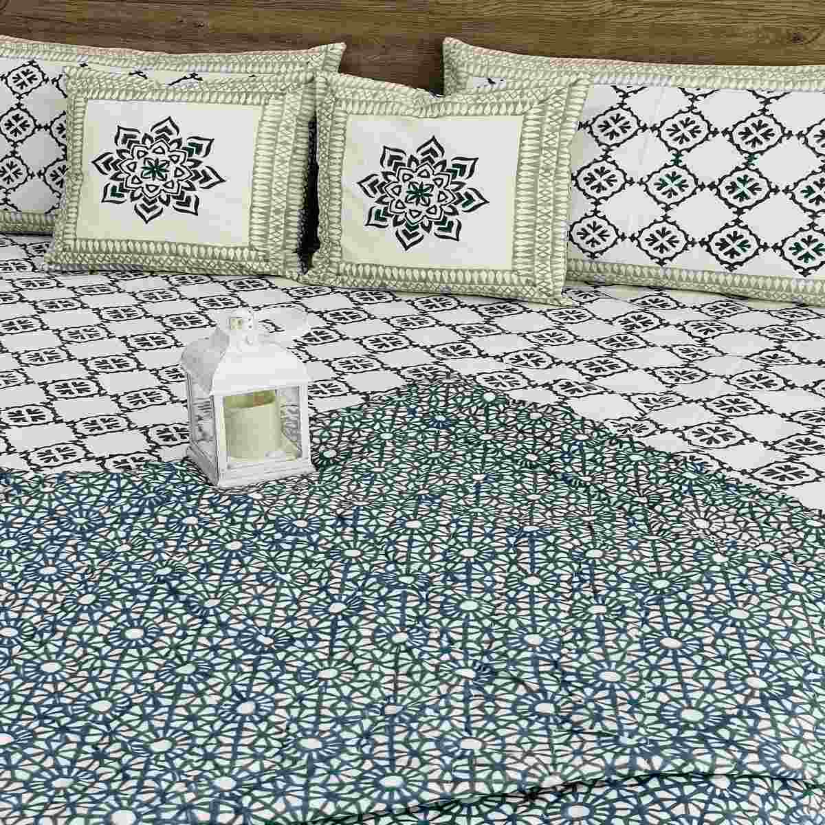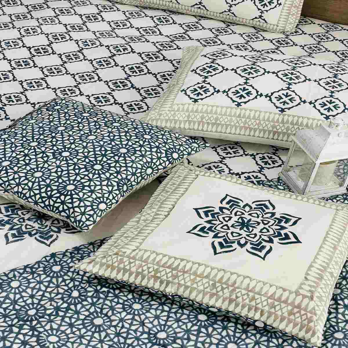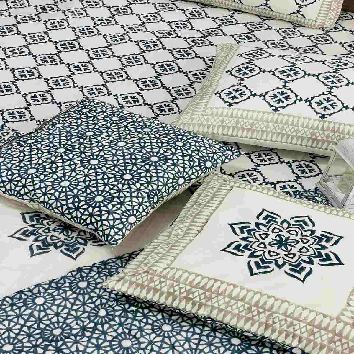 Premium Handblock Comforter set,Soft muslin cloth with surgical cotton filling comforter.Premium Handblock 400 TC 100% cotton flat kingsize bedsheet with 2 pillow covers,2 cushuion covers .Handcrafted by Indian master artisans,Made with super soft percale cotton,Size king 108*108* INCHES flat sheets.Pillow covers 18*28 INCHES,2 cushuion covers 16*16 INCHES.