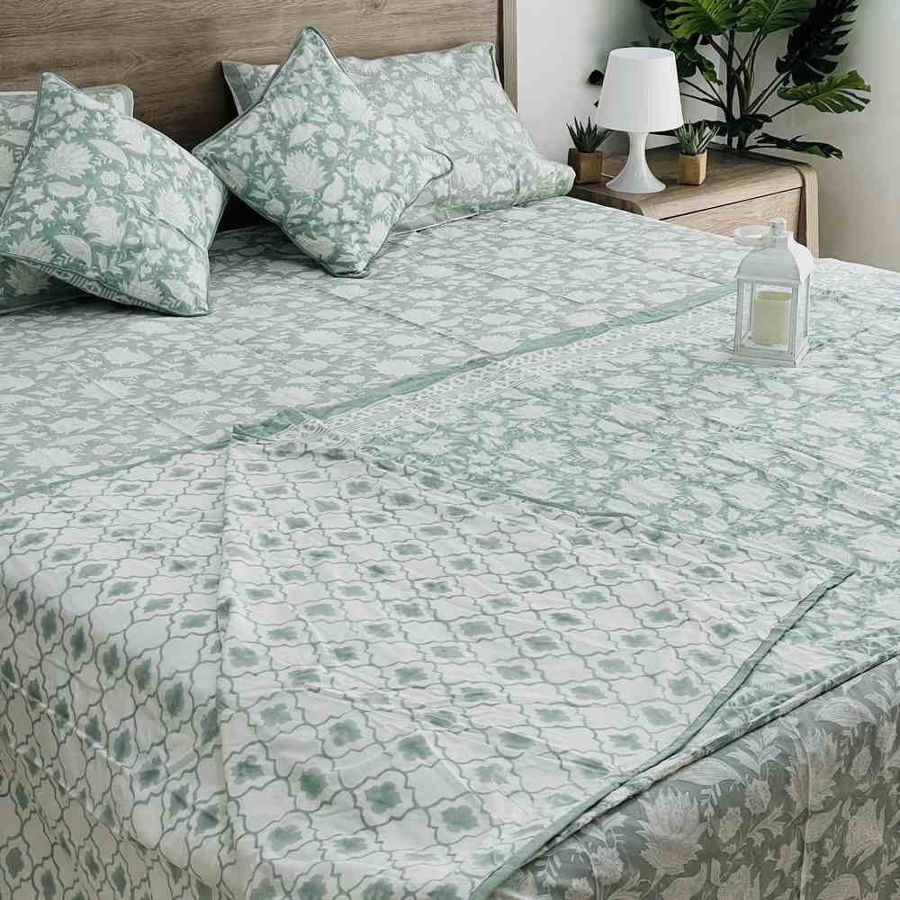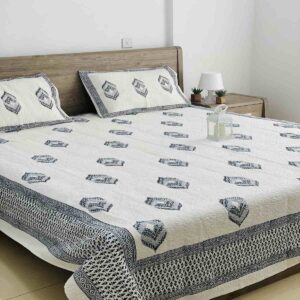 Premium Handblock Comforter set, Soft muslin cloth with surgical cotton filling comforter. Premium Handblock 400 TC 100% cotton flat kingsize bedsheet with 2 pillow covers, 2 cushuion covers . Handcrafted by Indian master artisans, Made with super soft percale cotton, Size king 108*108* INCHES flat sheets. Pillow covers 18*28 INCHES, 2 cushuion covers 16*16 INCHES.