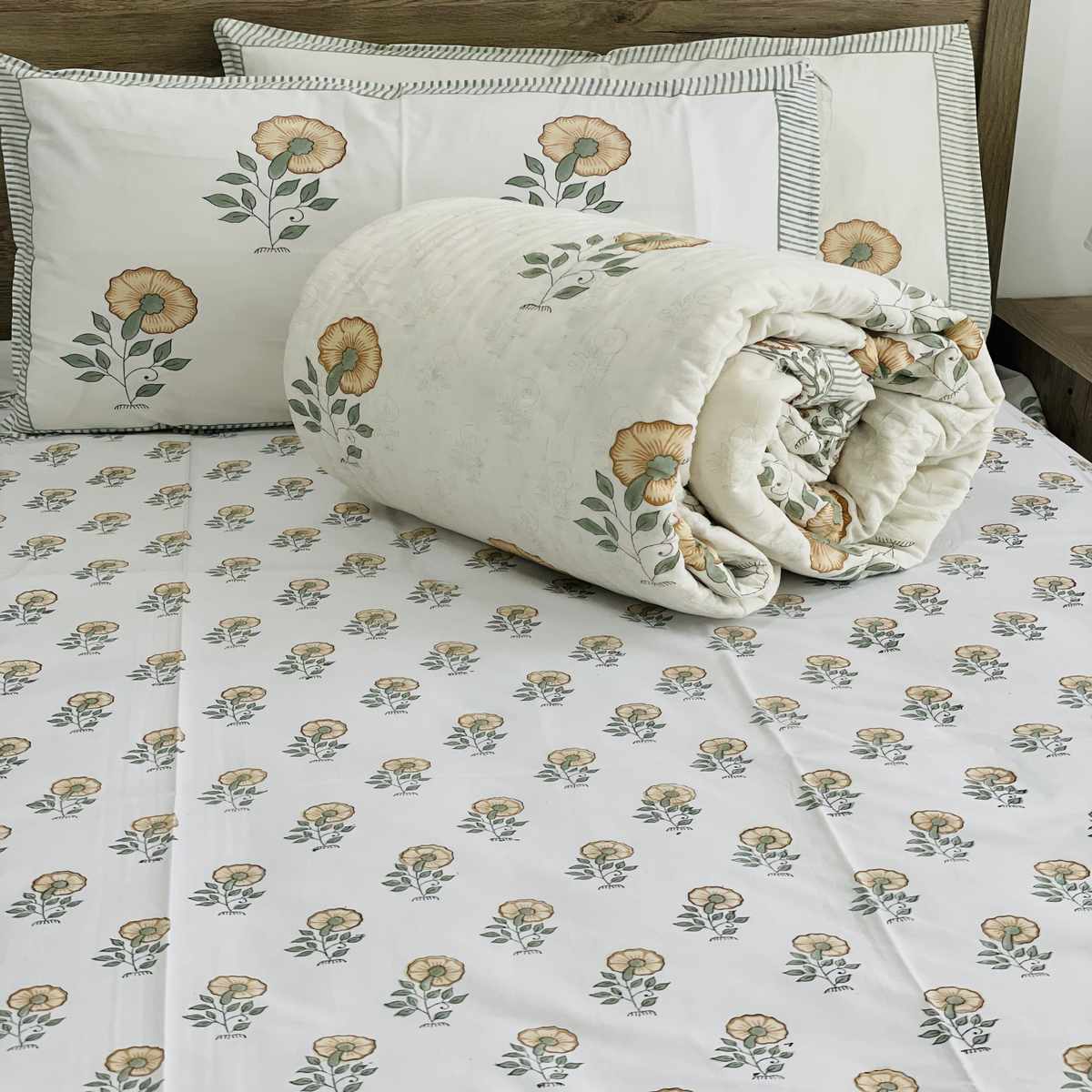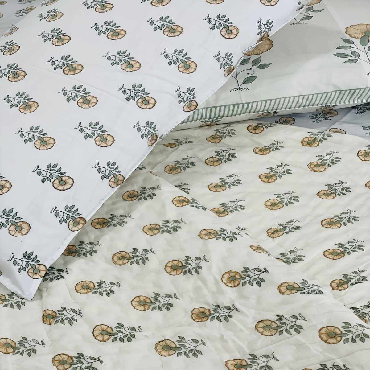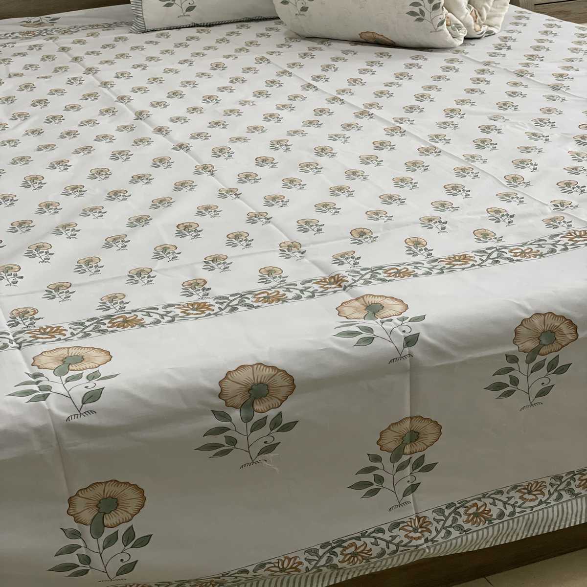Premium Handblock Comforter set, Soft muslin cloth with surgical cotton filling comforter.Premium Handblock 400 TC 100% cotton flat kingsize bedsheet with 2 pillow covers, Handcrafted by Indian master artisans, Made with super soft percale cotton, Size king 108*108* INCHES flat sheets.Pillow covers 18*28 INCHES.