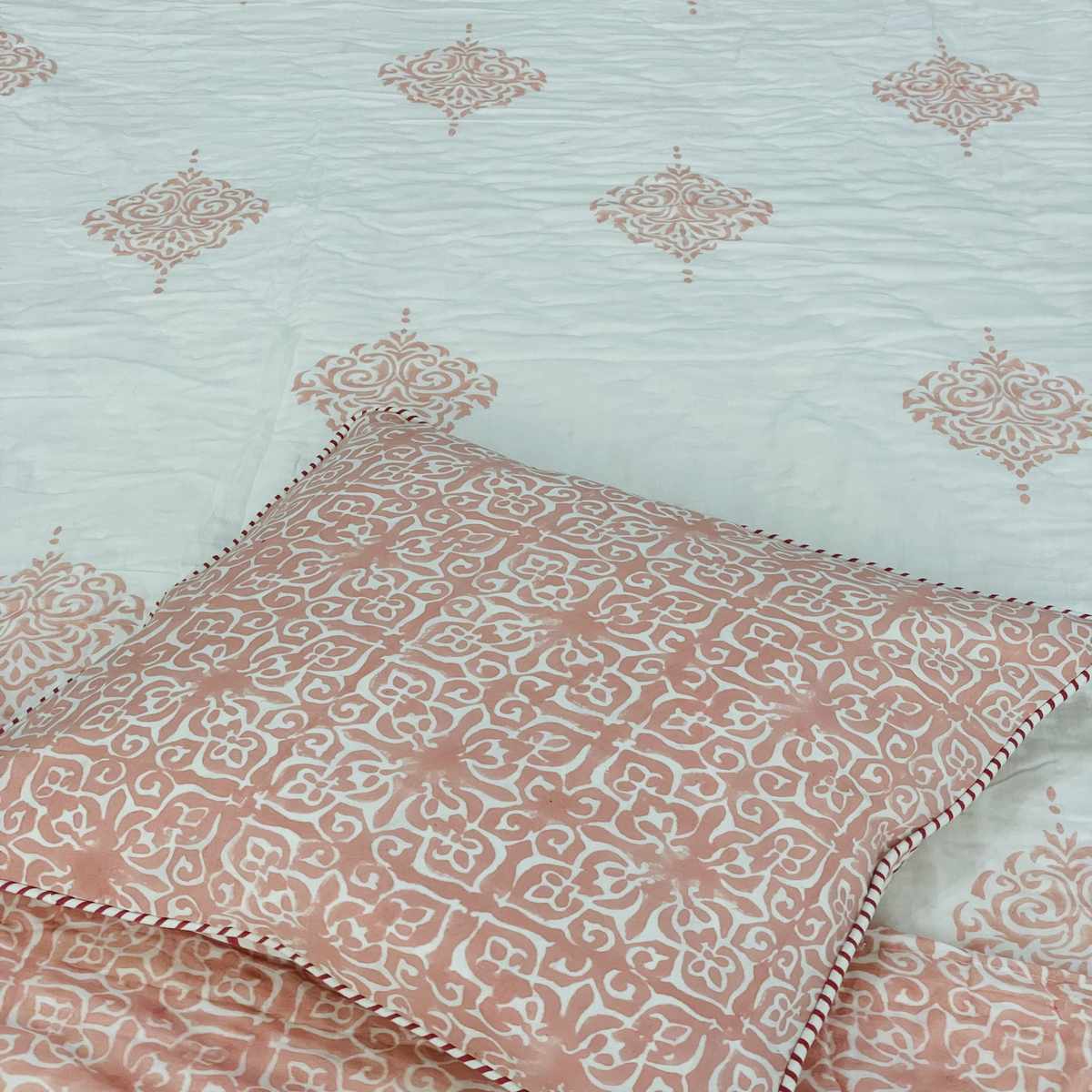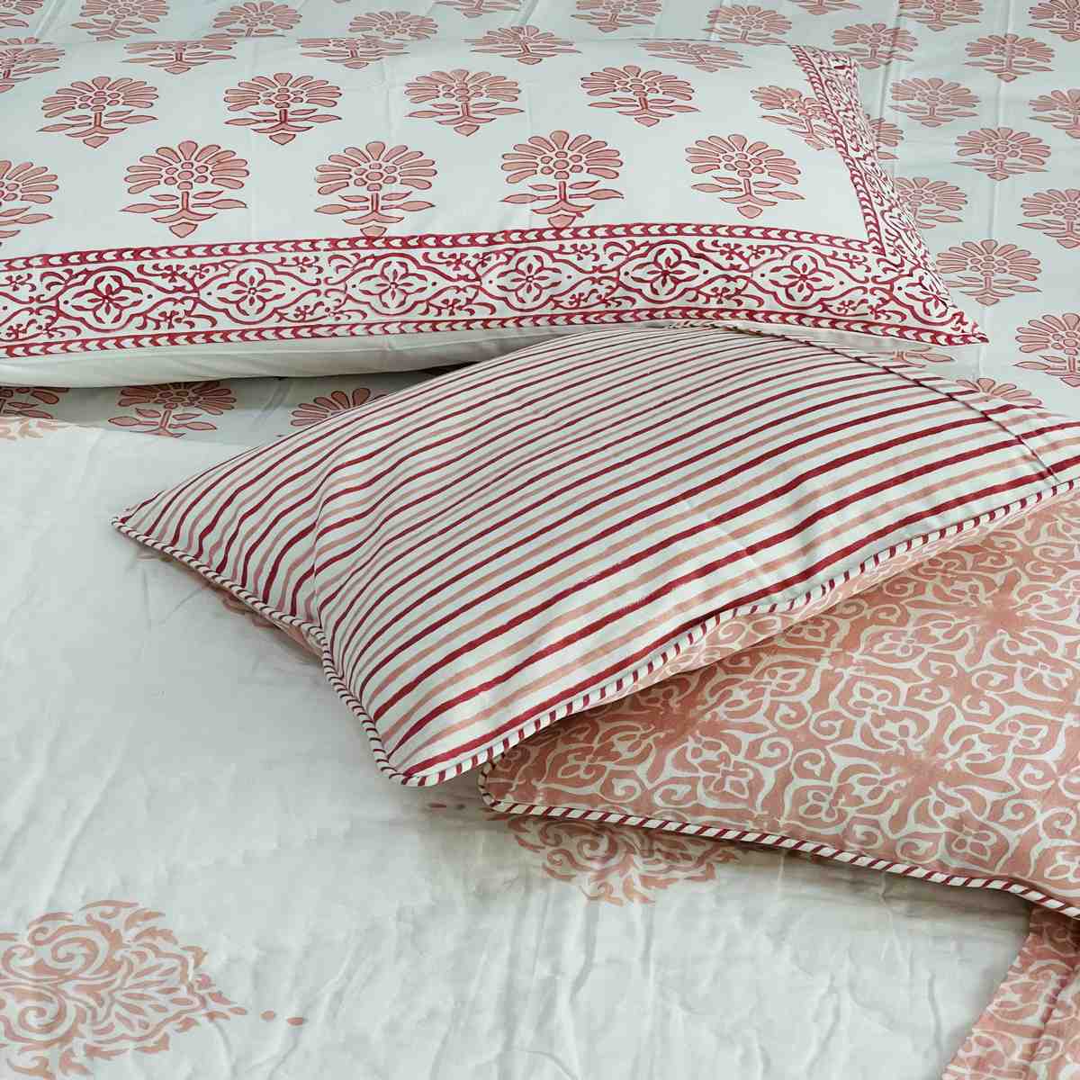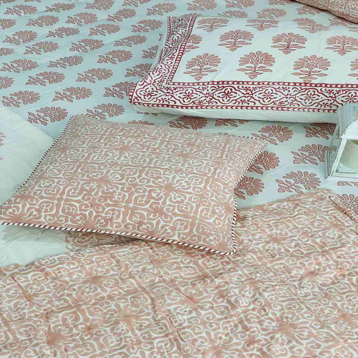 Premium Handblock Comforter set,Soft muslin cloth with surgical cotton filling comforter.Premium Handblock 400 TC 100% cotton flat kingsize bedsheet with 2 pillow covers,2 cushuion covers 16*16 inchesHandcrafted by Indian master artisans,Made with super soft percale cotton,Size king 108*108* INCHES flat sheets.Pillow covers 18*28 INCHES.
